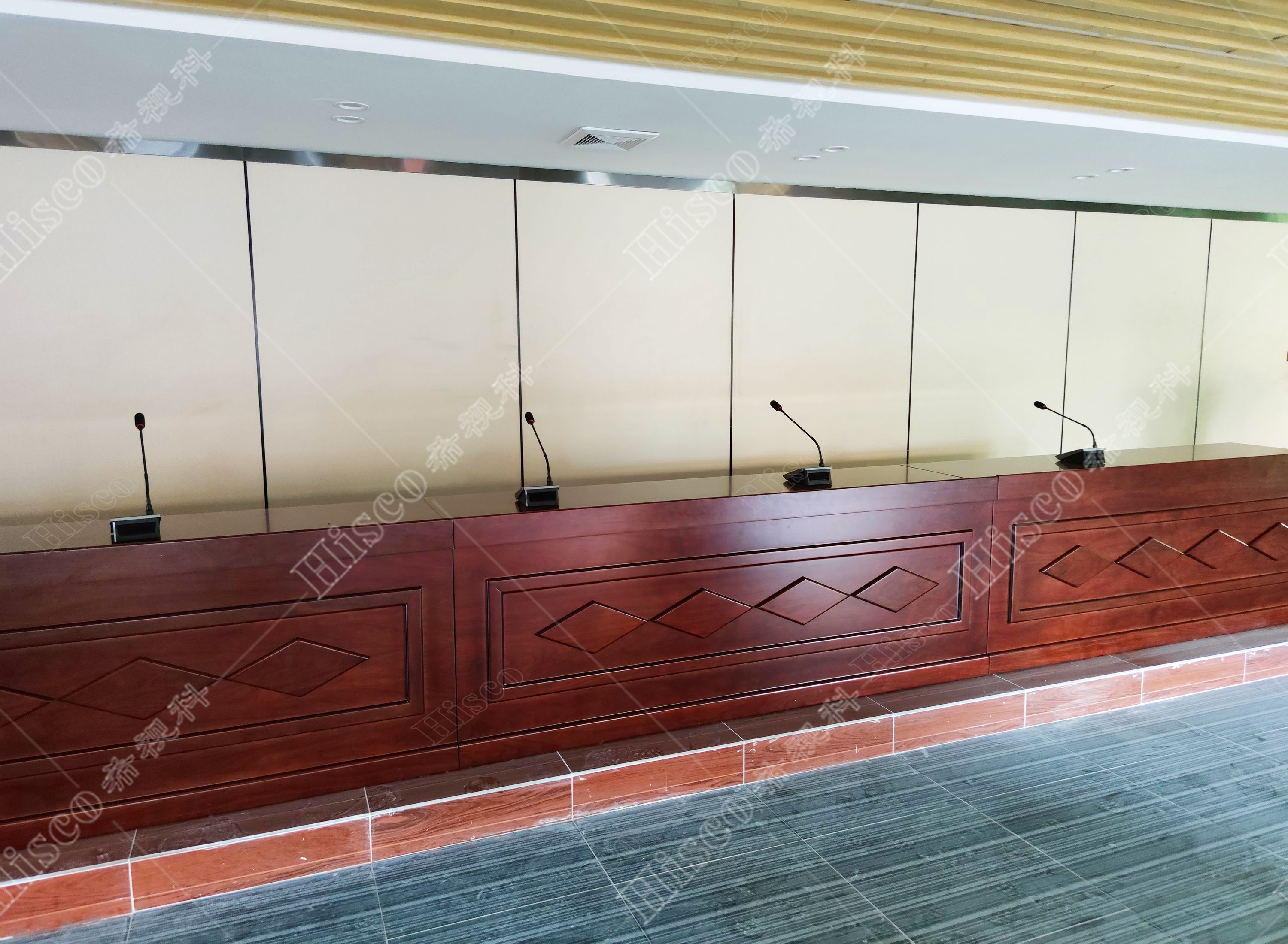 随着当今科技的飞速发展,老式的会议形式已无法适应现代化会议系统的要求。现代化的数字会议系统会议程序简单化、功能多样化,能够对会议实施控制、管理,包括声音传送稳定纯正,讨论清晰有序,使整个会议形式具有高效性。本次会议室设计采用数字会议系统,扩声系统、显示系统、集中控制系统、矩阵系统、无纸化升降等,实现会议室的多媒体会议功能,满足简洁流畅的会议过程、逼真传神的听觉效果、清晰舒适的视频显示、智能的摄像跟踪、媒体音视频信号源矩阵切换和中央集成控制等要求